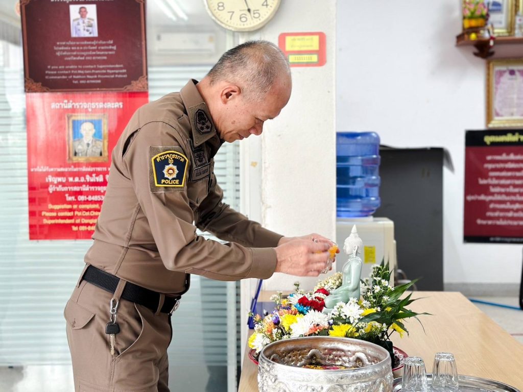 ข้าราชการตำรวจ สภ.ดงละคร ร่วมกิจกรรม “สรงน้ำพระ” พระพุทธรูปประจำ สภ. ซึ่งเป็นที่ยึดเหนียวจิตใจข้าราชการตำรวจ