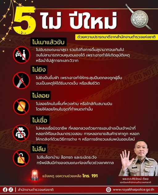 สำนักงานตำรวจแห่งชาติ จึงขอแนะนำ “5 ไม่ ปีใหม่” ส่งท้ายปีเก่า เพื่อให้พี่น้องประชาชนระมัดระวังการกระทำที่อาจก่อให้เกิดอันตรายกับบุคคลอื่น และอาจเข้าข่ายเป็นความผิดตามกฎหมาย รวมไปถึงระวังภัยจากมิจฉาชีพที่อาจฉวยโอกาสก่อเหตุในช่วงเทศกาล ดังนี้