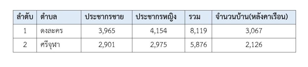 2.ตำบลศรีจุฬา มีทั้งหมด 12 หมู่บ้าน จำนวนประชากรชาย 2,901 คน ประชากรหญิง 2,975 คน รวมทั้งหมด 5,876 คน